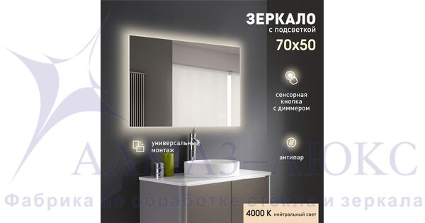 Зеркало с фоновой подсветкой, сенсорной кнопкой и подогревом Delhi 7050sh-4 (70