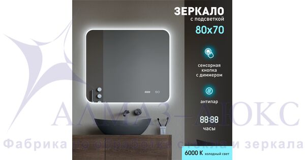 Зеркало с фоново-фронтальной подсветкой, сенсорной кнопкой, подогревом и часами