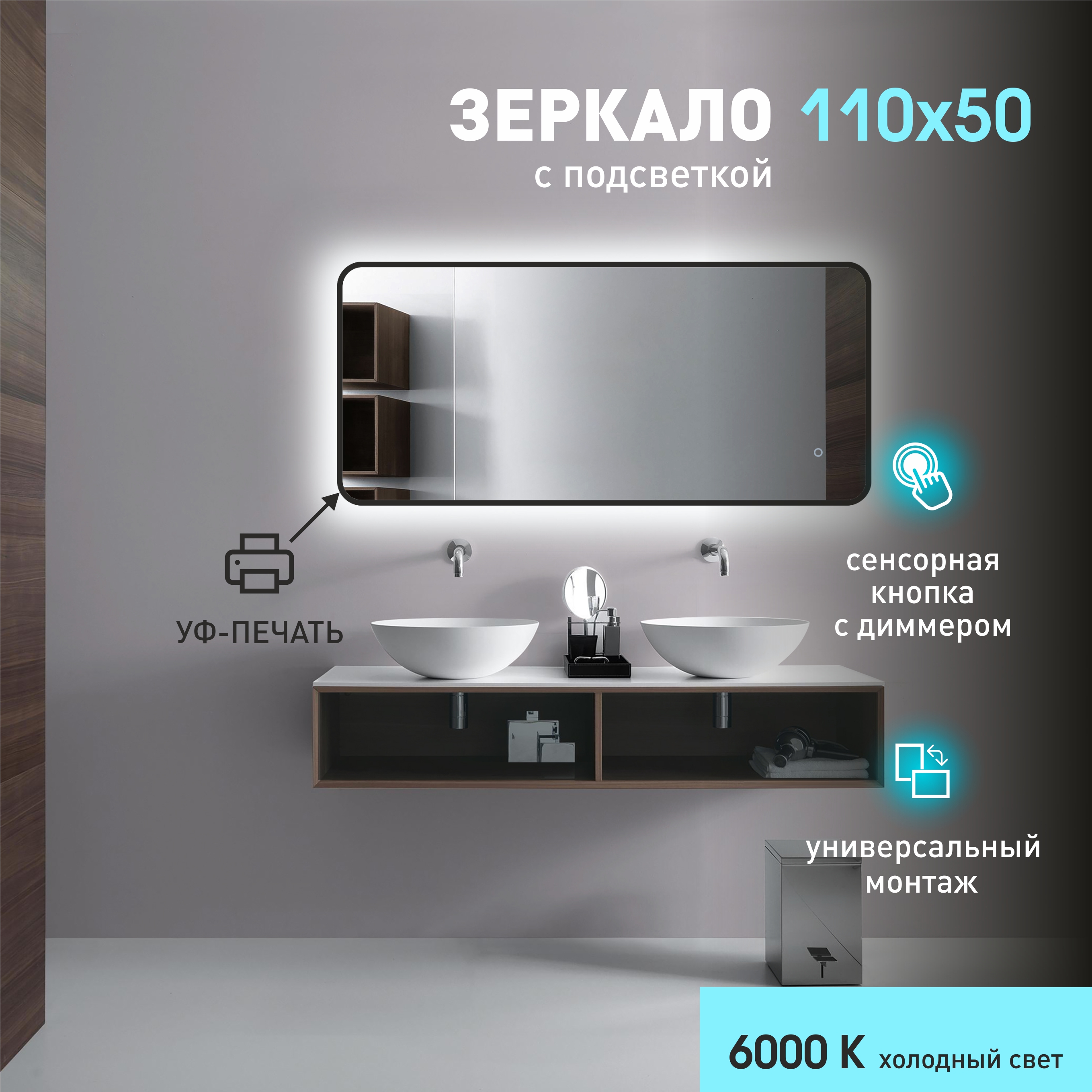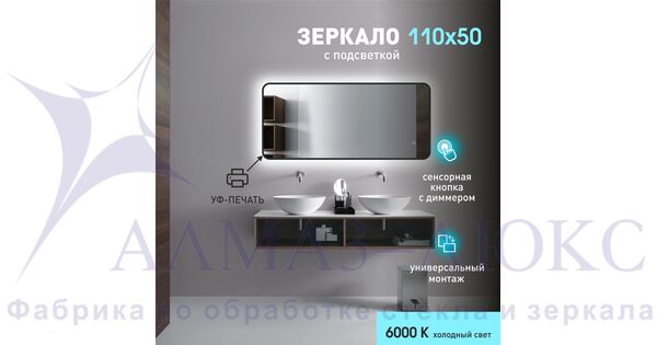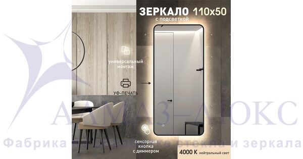 Зеркало с фоновой подсветкой, с сенсорной кнопкой и чёрной УФ-окантовкой