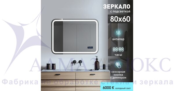 Зеркало с фронтальной подсветкой, с сенсорной кнопкой, часами, датой, подогревом