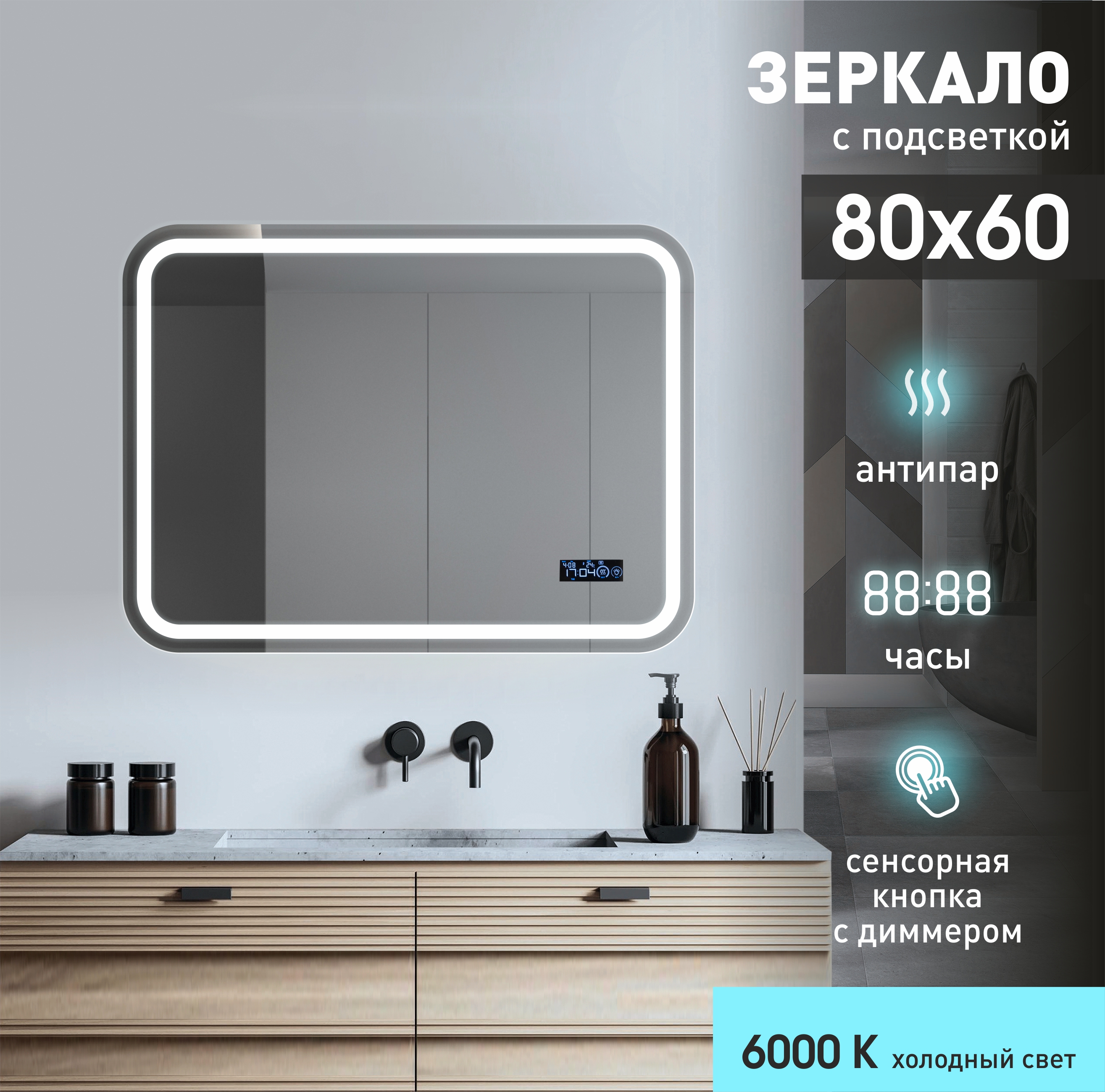 Зеркало с подсветкой, с сенсорной кнопкой, часами, датой, подогревом, датчиком т