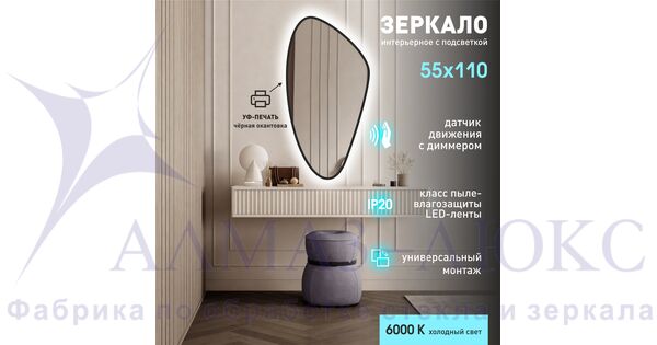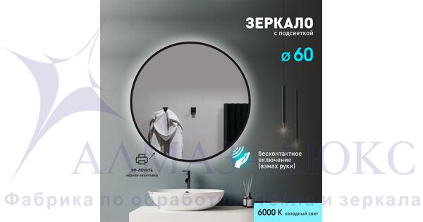 Зеркало с фоновой подсветкой, торцевым датчиком движения и чёрной УФ-окантовкой