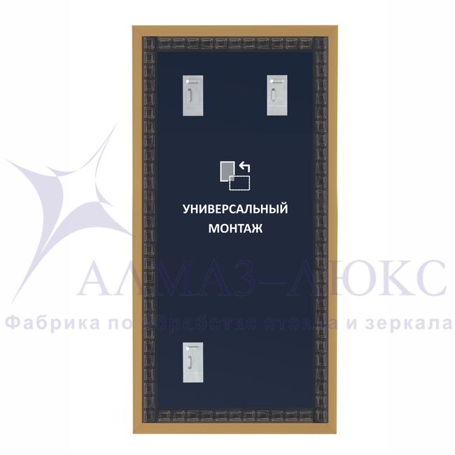 Рама изготовлена из вспененного полистирола, что обеспечивает ей лёгкость и прочность, а также устойчивость к влаге и перепадам температур. Благодаря тщательно подобранному дизайну багета, зеркало гармонично впишется как в классический, так и современный стиль, добавляя пространству света и визуального объёма. Зеркало имеет 2 вида крепления: для вертикальной и горизонтальной ориентации.