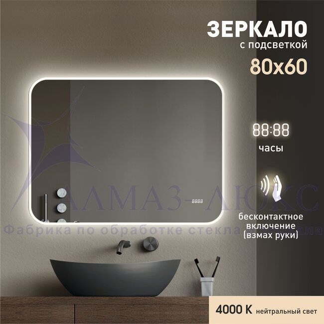 Зеркало с бесконтактным включением - с торцевым датчиком движения. Для включения зеркала достаточно сделать взмах рукой со стороны датчика на расстоянии 4-7 см. Датчик (с функцией памяти) оснащен диммером - регулировкой яркости подсветки. Датчик смонтирован на обратной стороне зеркала за зеркальным полотном и не заметен для глаз.