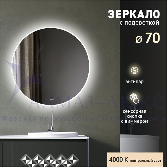 Зеркало с фоново-фронтальной подсветкой, с сенсорной кнопкой и подогревом Oslo 70sh-4 (D 70см) - нейтральный свет
