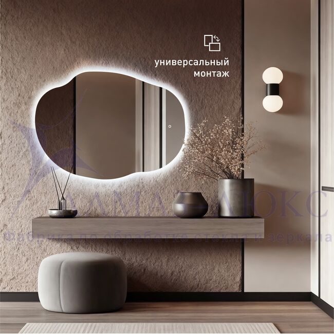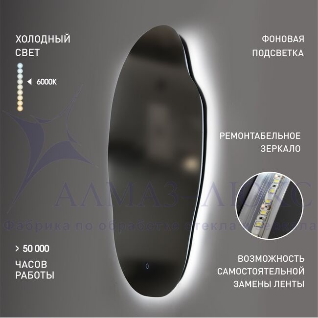 Необычная форма зеркала «Fiji» привлекает внимание и делает его превосходным декоративным элементом. Открытая фоновая подсветка гармонично подчёркивает контуры изделия, добавляя ему уникальности и изысканности. Изготовлено из зеркального полотна толщиной 4мм, уровень пылевлагозащиты IP-20. Зеркало предназначено для использования в помещениях в низкой влажностью: спальни, гостиные, коридоры и других сухих зонах. Цвет света холодный (6000K).