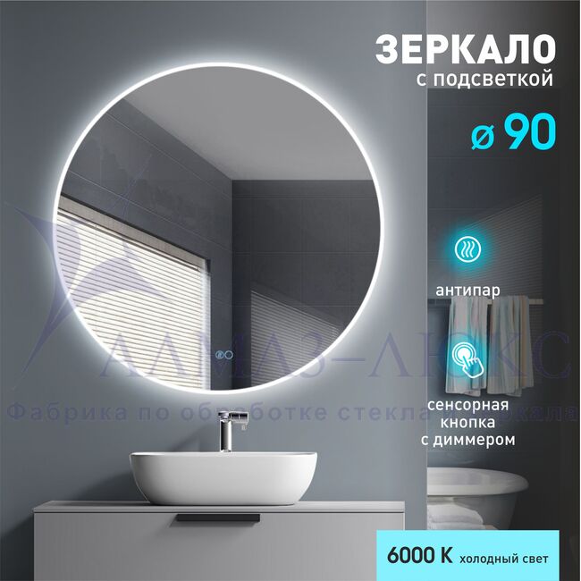 Зеркало с фронтально-фоновой подсветкой, сенсорной кнопкой и подогревом Oslo 90sh-6 (D 90 см) – холодный свет.