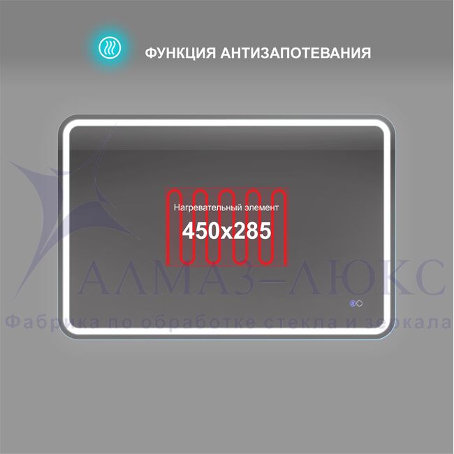 Данная модель led-зеркала "Lima" с двойной сенсорной кнопкой. Первая включает подсветку, вторая активирует функцию подогрева, которая помогает предотвратить запотевание зеркала. Это особенно полезно в ванных комнатах, где высокая влажность может затруднить обзор. «Антипар» работает благодаря двойному мату подогрева размером 450х225 мм, смонтированному по центру с обратной стороны зеркала. Для изменения яркости света подержите палец на сенсоре, благодаря диммеру (регулировка яркости свечения) - плавное включение света всегда будет радовать Ваши глаза. Также кнопка имеет память и все последующие включения будут на последнем уровне яркости.