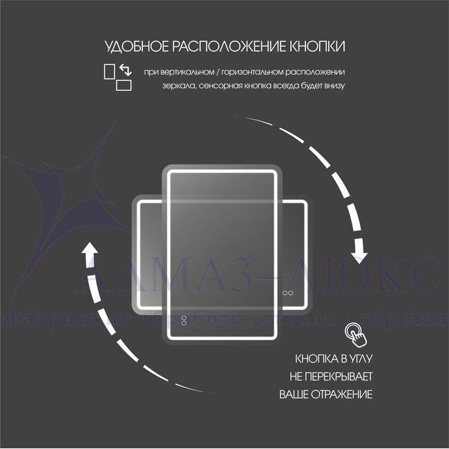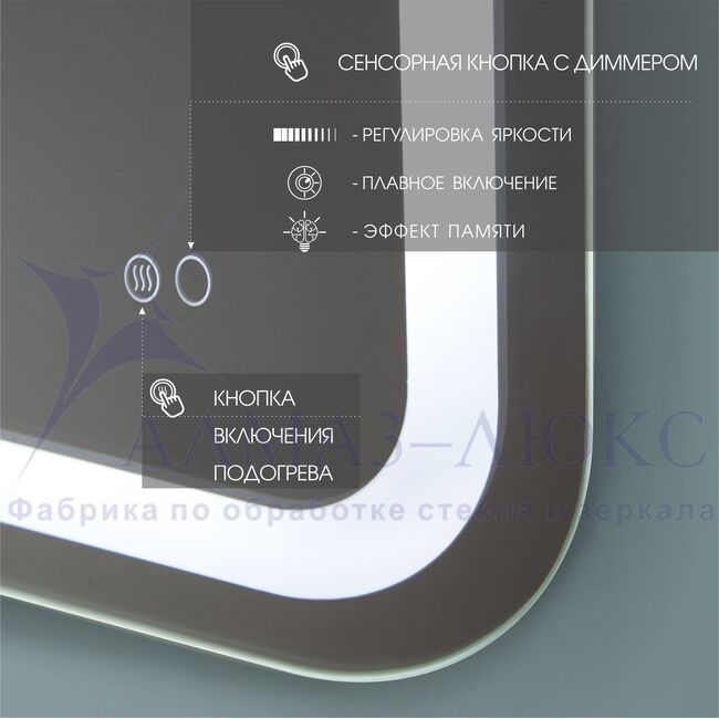 Данная модель led-зеркала "Lima" с двойной сенсорной кнопкой. Первая включает подсветку, вторая активирует функцию подогрева, которая помогает предотвратить запотевание зеркала. Это особенно полезно в ванных комнатах, где высокая влажность может затруднить обзор. «Антипар» работает благодаря двойному мату подогрева размером 570х450 мм, смонтированному по центру с обратной стороны зеркала. Для изменения яркости света подержите палец на сенсоре, благодаря диммеру (регулировка яркости свечения) - плавное включение света всегда будет радовать Ваши глаза. Также кнопка имеет память и все последующие включения будут на последнем уровне яркости.