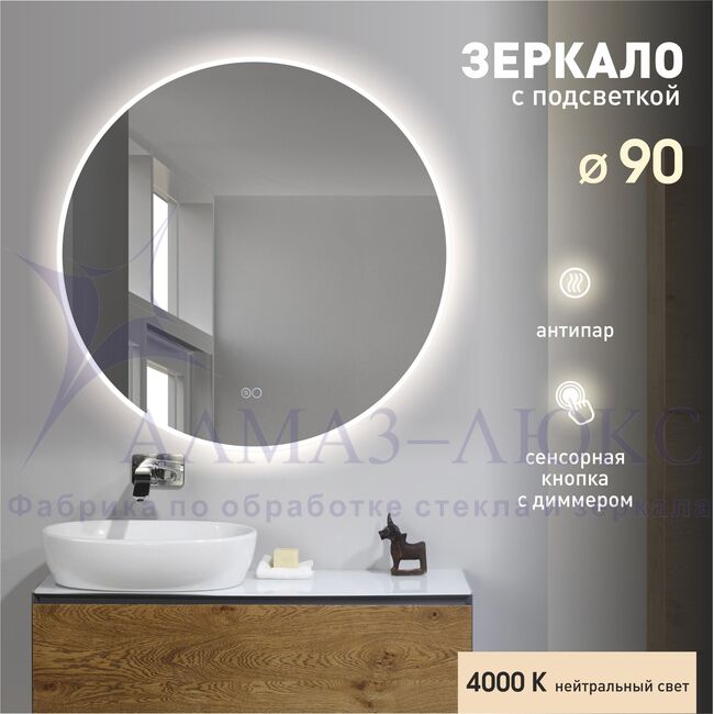 Зеркало с фронтально-фоновой подсветкой, сенсорной кнопкой и подогревом Oslo 90sh-4 (D 90 см) – нейтральный свет.