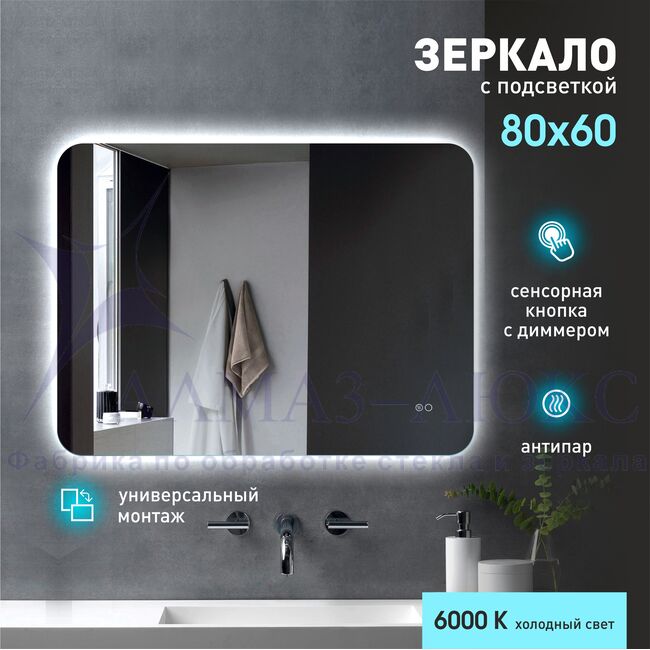 Зеркало с подсветкой, с сенсорной кнопкой и подогревом Hanoi 6080sh-6 (60х80см) - холодный свет