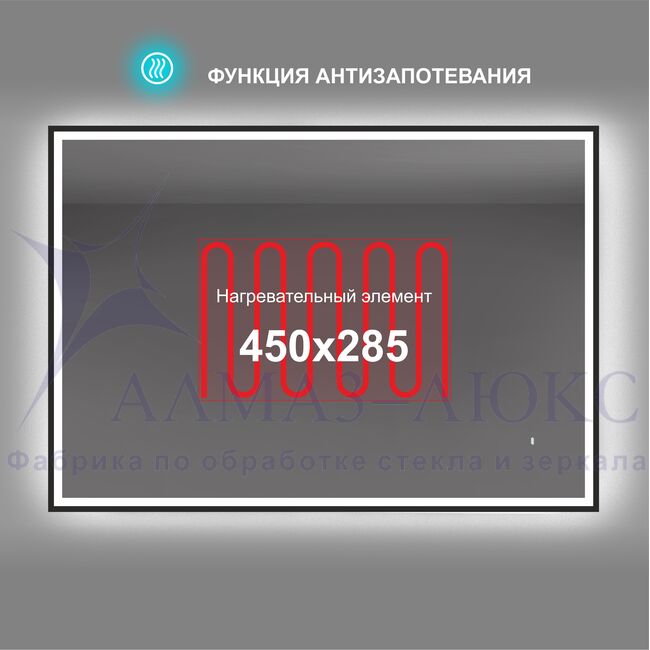 Данная модель led-зеркала с подогревом (функция "антипар") .«Антипар» работает благодаря двойному мату подогрева размером 450х225 мм, смонтированному по центру с обратной стороны зеркала.