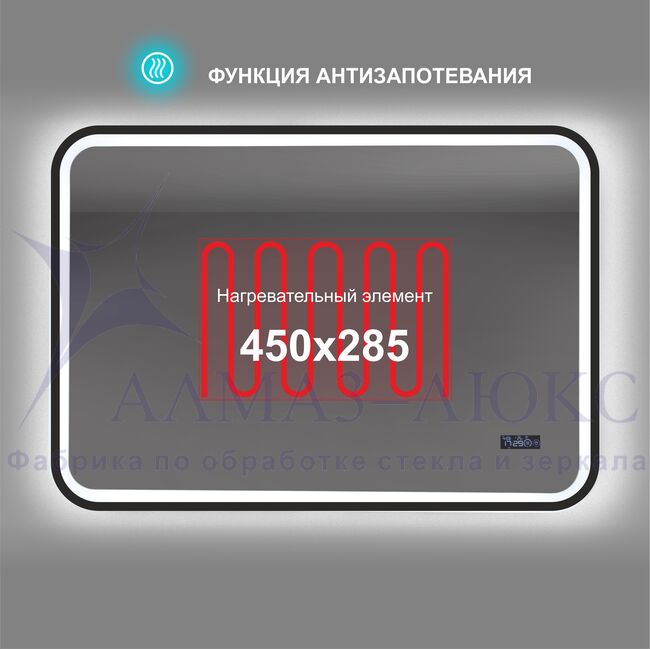 Подогрев осуществляет функцию антизапотевания, что очень удобно при принятии водных горячих процедур. «Антипар» работает благодаря двойному мату подогрева размером 450х225 мм, смонтированному по центру с обратной стороны зеркала.